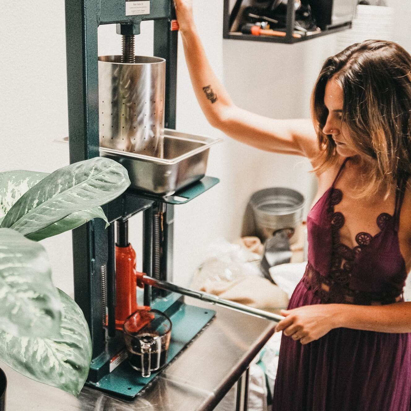 Herbs are pressed by hand using a hydraulic press to yield a potent liquid extract.